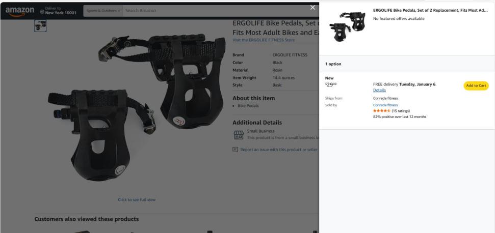 | 1 | 1 | ERGOLIFE Bike Pedals | USA | 1225023 |