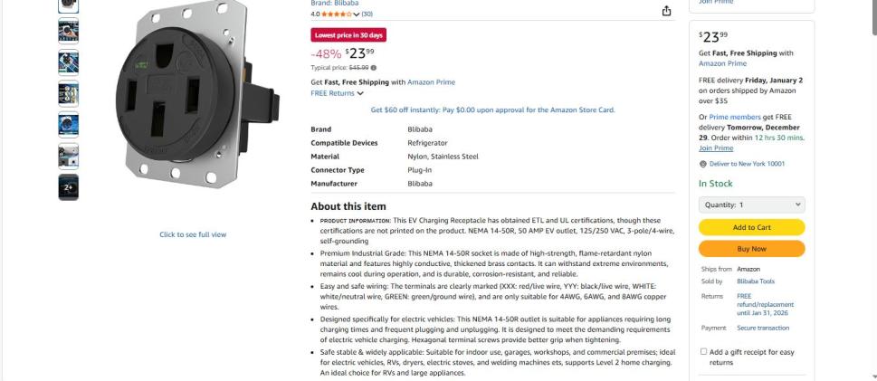 | 2 | 1 | 50 Amp EV Charging Receptacle | USA | 1225044 |