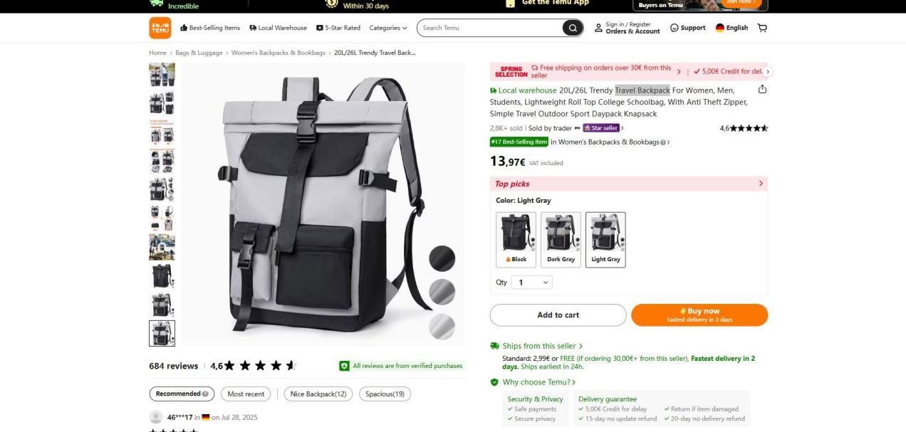 | 1 | 1 | Reiserucksack | TEMU REVIEW DE | 1369673 |