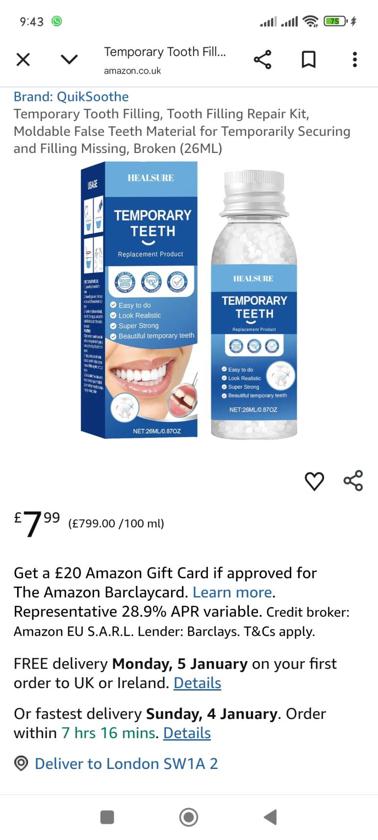 | 1 | 1 | Temporary tooth filling 26ML | UK | 1233892 |