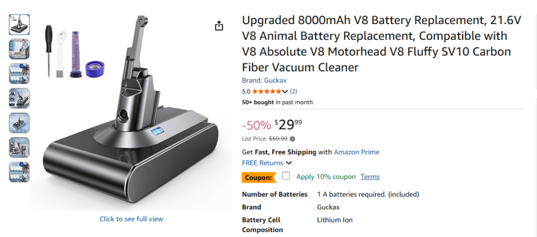 | 10 | 10 | dyson v8 battery | USA | 1248413 |