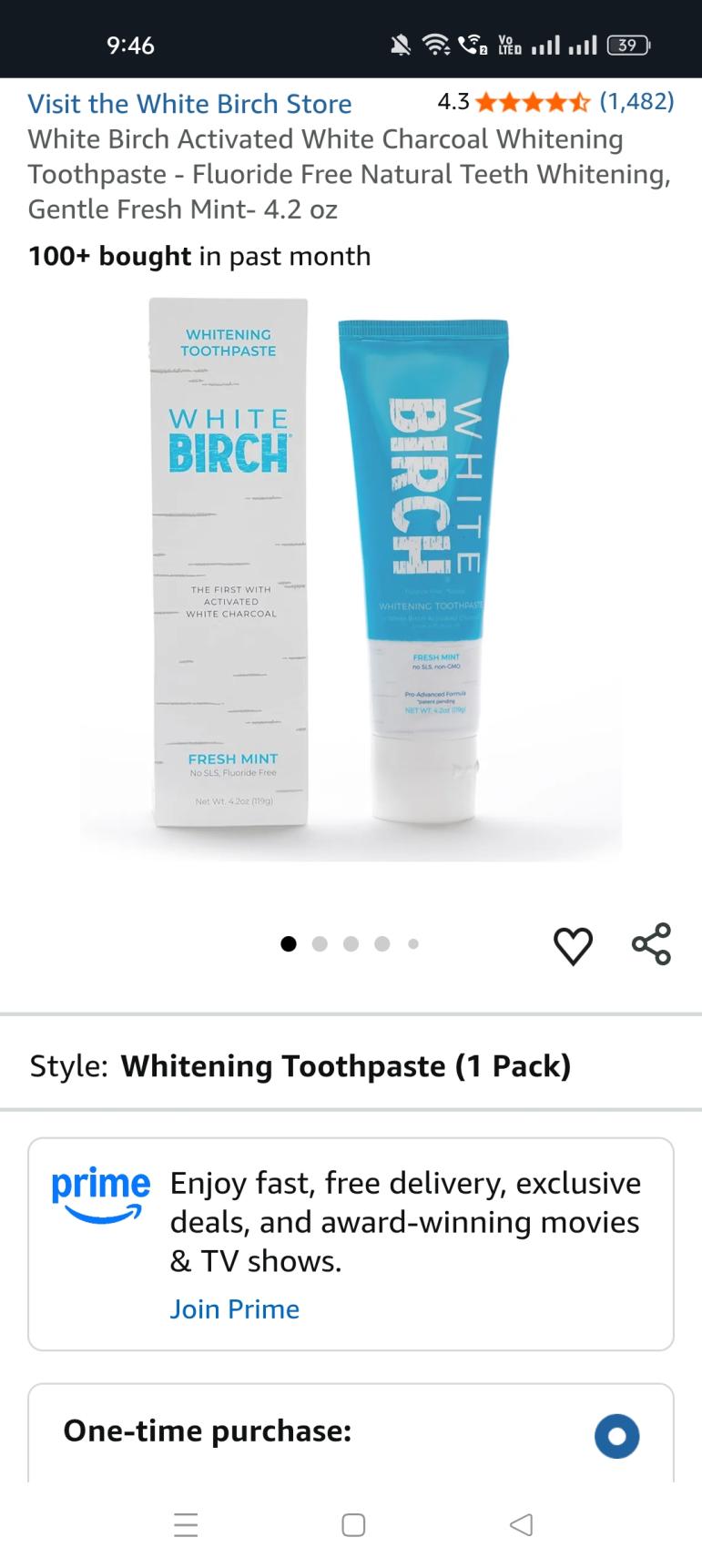White Birch Activated White Charcoal Whitening Toothpaste - Fluoride Free Natural Teeth Whitening, Gentle Fresh Mint- 4.2 oz
