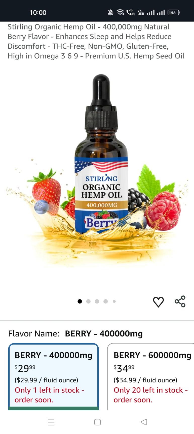 Stirling Organic Hemp Oil - 400,000mg Natural Berry Flavor - Enhances Sleep and Helps Reduce Discomfort - THC-Free, Non-GMO, Gluten-Free, High in Omega 3 6 9 - Premium U.S. Hemp Seed Oil