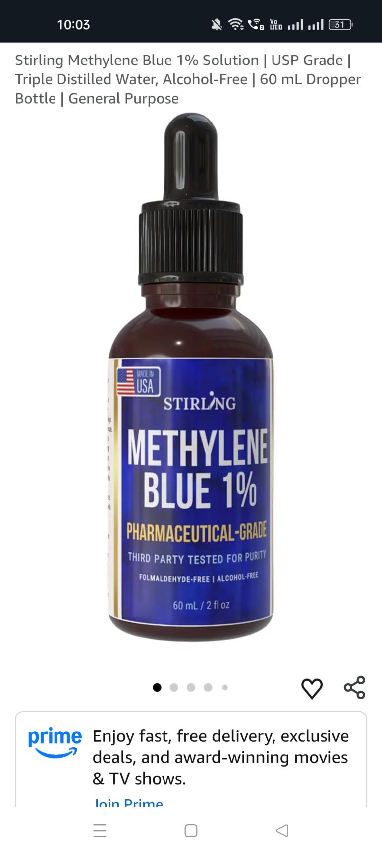 Stirling Methylene Blue 1% Solution | USP Grade | Triple Distilled Water, Alcohol-Free | 60 mL Dropper Bottle | General Purpose
