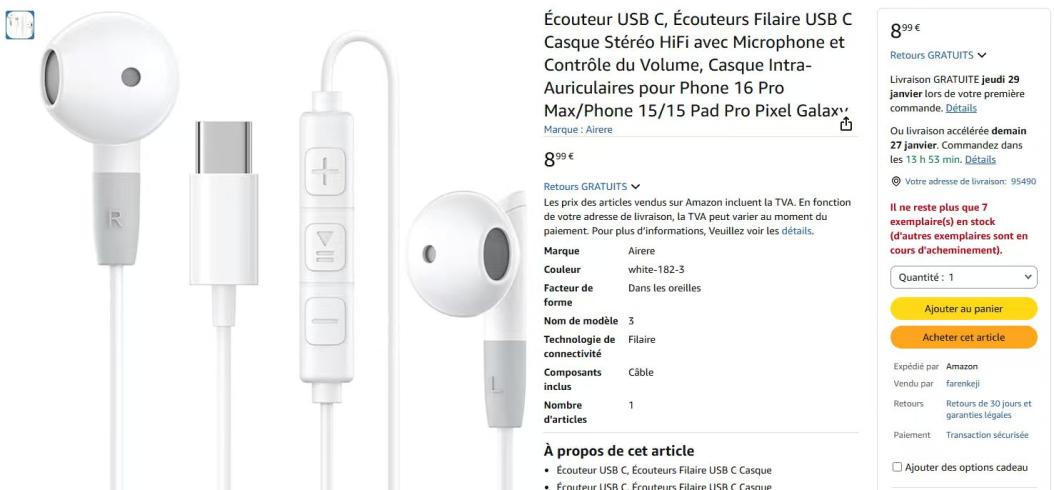 | 1 | 1 | Airere Écouteur USB C | RATING FR | 1282143 |