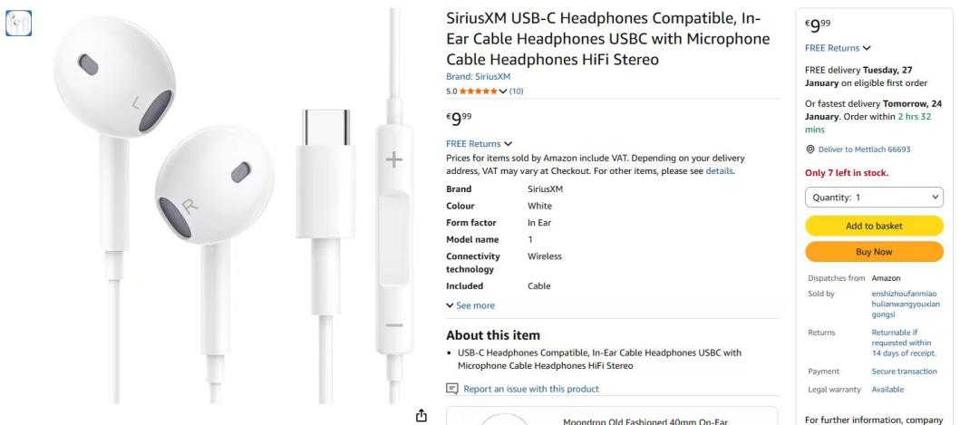 | 1 | 1 | SiriusXM USB-C Kopfhörer Kompatibel, In-Ear Kabelkopfhörer | NO REVIEW IT | 1282163 |