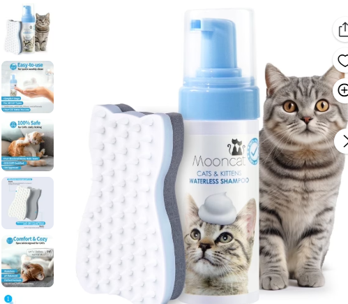 Cat Shampoo and Brush Kit https://www.walmart.com/ip/Mooncat-Waterless-Cat-Shampoo-Cat-Brush-Licking-Safe-Dry-Shampoo-for-Cats-for-short-hair-5-oz/5303909113?classType=REGULAR&from=/search