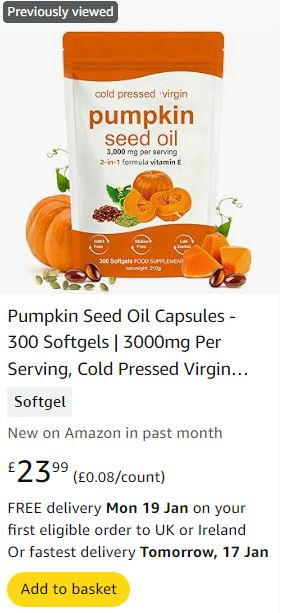 | 1 | 1 | Pumpkin Seed Oil Capsules 300 Vegan Softgels | UK | 1265828 |