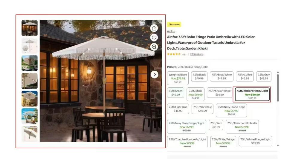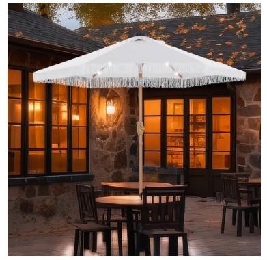 | 1 | 1 | Ainfox 7.5 ft Boho Fringe Patio Umbrella with LED Solar Lights,Waterproof Outdoor Tassels Umbrella for Deck, Table, Garden, White | WALMART USA | 1251638 |