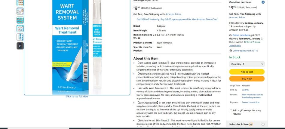 | 1 | 1 | Wart and mole Remover | USA | 1242600 |
