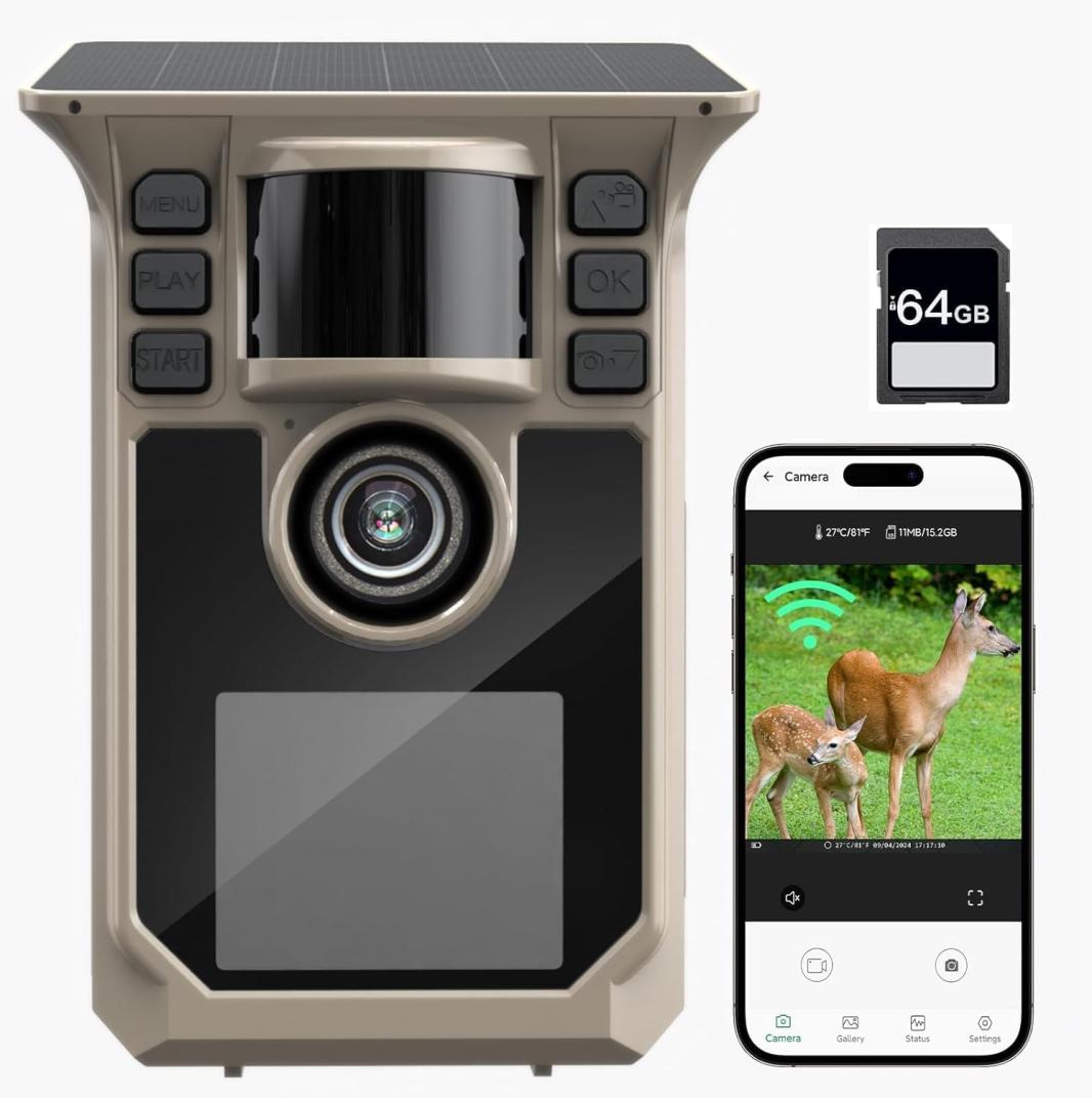 Trail Camera 4K 64MP WiFi Solar Game Camera, 5000mAh Forever Power, 64GB Memory Card and Ip67 Waterproof Night Vision Trail Cam for Outdoor Wildlife Detection (Brown)