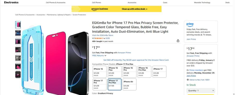 | 2 | 2 | privacy screen iphone 17 pro max | NO REVIEW USA | 1223370 |
