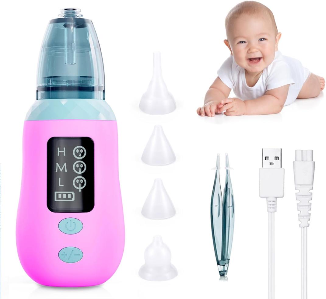 Sauger Baby Nasensauger, Nasensauger Baby Elektrisch mit LED-Lampe, 4 wiederverwendbare Silikon-Rotzsaugerdüsen & 3 Saugstufen für Neugeborene