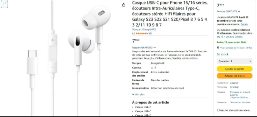 | 10 | 10 | Casque USB-C pour phone 15/16 series ecouteurs intra airculaires type C | DE | 1186759 |