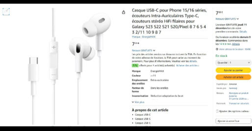 | 10 | 10 | Casque USB-C pour phone 15/16 series ecouteurs intra airculaires type C | IT | 1173367 |