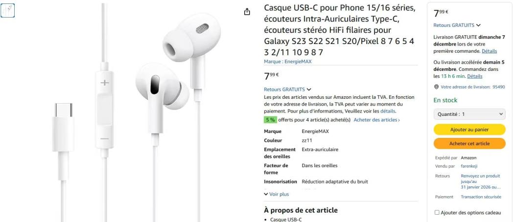 | 15 | 15 | Casque USB-C pour phone 15/16 series ecouteurs intra airculaires type C | RATING FR | 1160979 |
