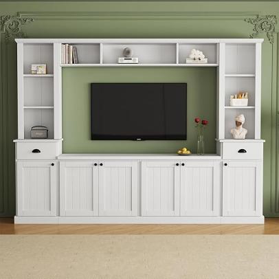 Acarra Minimalist Entertainment Wall Unit Set with Bridge, Large TV Stand for TVs Up to 75 Inch, Modern Media Console with Adjustable Shelves & Ample Storage, Living Room TV Cabinet Set, White