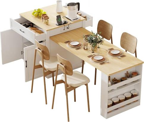 Acarra 82.7 Inch Kitchen Island with Extendable Dining Table for 2–6, Rolling Kitchen Island with Storage, Power Outlet, 2 Drawers, Cabinets & Shelves, Two-Tone White
