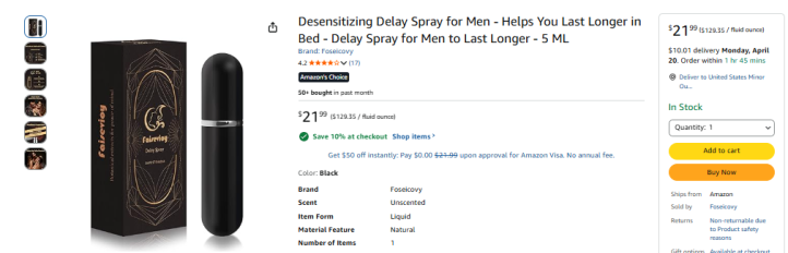 | 1 | 1 | "promescent last long spray jaxvolt seaweed erection spray " | USA | 1373376 |