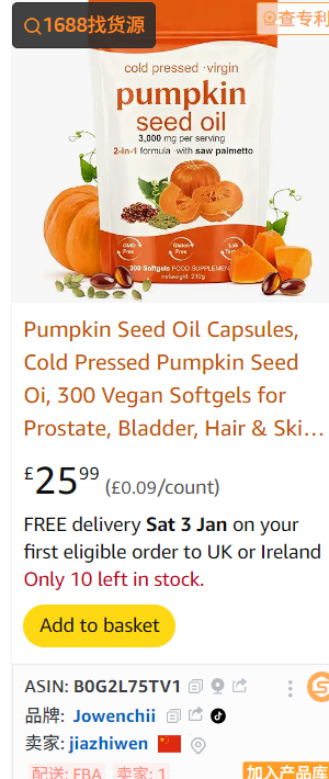 | 1 | 1 | Pumpkin Seed Oil 300 Softgels | UK | 1285248 |