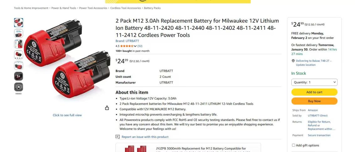 | 2 | 2 | milwaukee m12 battery | CA | 1289120 |