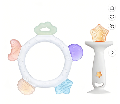 Smasener 2 Pcs Baby Teething Toys for 6-12 Months [https://www.walmart.com/ip/Smasener-3-Pcs-Baby-Teething-Toys-6-12-Months-Infants-Toddlers-Easy-Grip-Easy-Clean-Relieves-Teething-Discomfort-Soothes-Sore-Gums-Star-Ring-Teething/19189604455?classType=REGUL