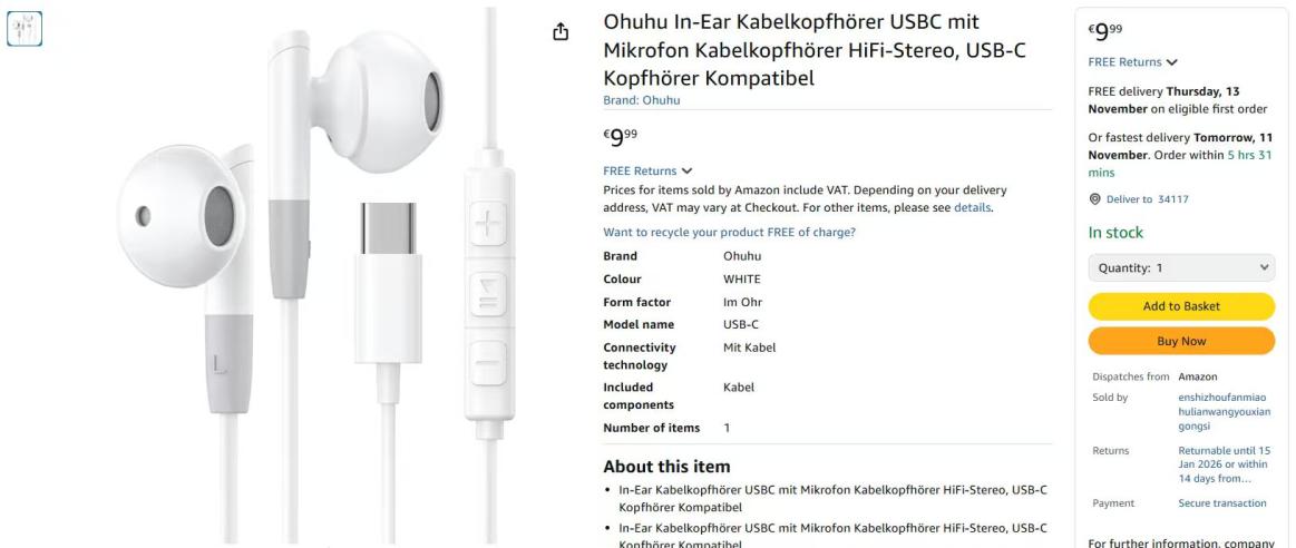 | 3 | 3 | Ohuhu In-Ear Kabelkopfhörer USBC mit Mikrofon | DE | 1095088 |
