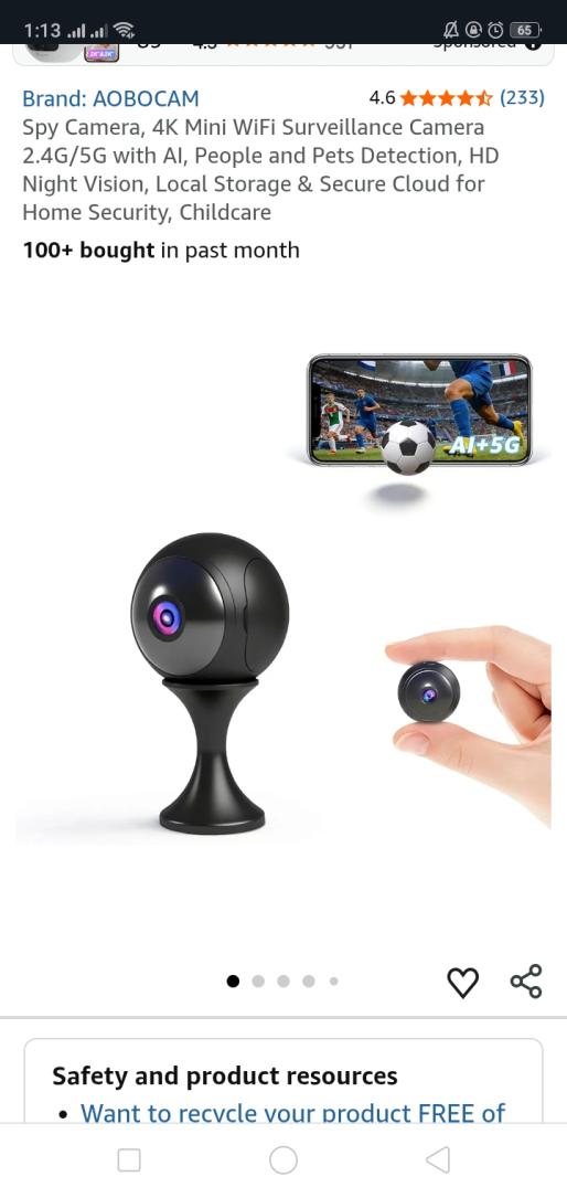 | 1 | 1 | Spy Camera, 4K Mini WiFi Surveillance Camera 2.4G/5G | FR | 1308036 |
