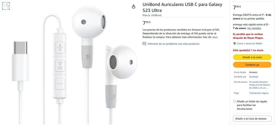 | 3 | 3 | UniBond Auriculares USB C para Galaxy S23 Ultra | ES | 1240165 |