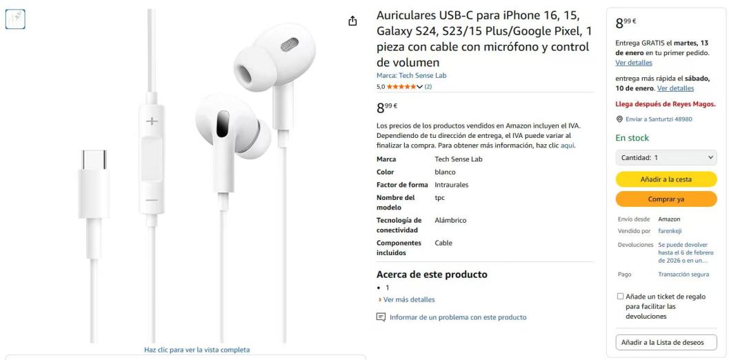 | 3 | 3 | Tech Sense Lab Écouteurs USB-C pour iPhone 16 | ES | 1240188 |