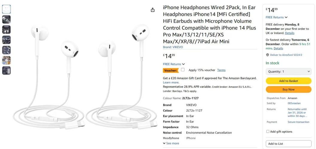 | 1 | 1 | VIKEVO iphone headphones wired | UK | 1165051 |